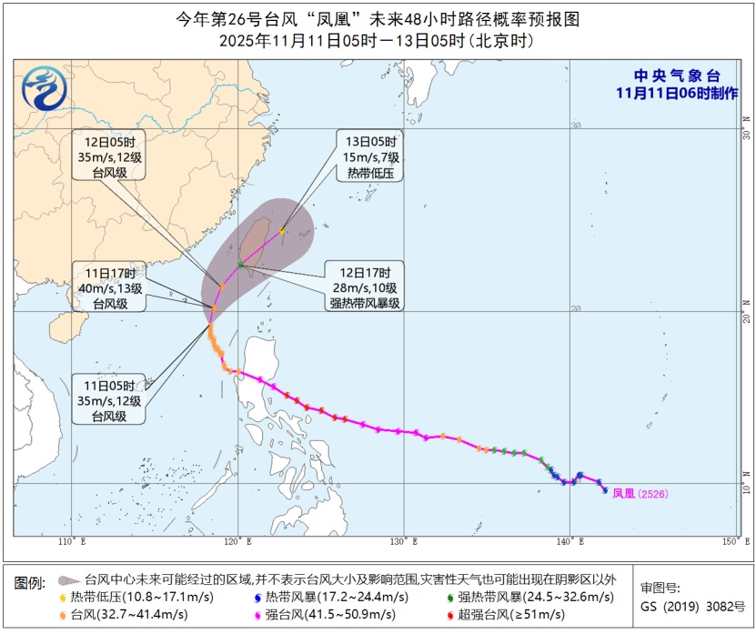 预计“凤凰”将以每小时10公里左右的速度向东北方向移动。 11日白天其强度将保持或略有增强。 11日晚间逐渐转向东北方向并逐渐急剧减弱。麻省理工学院将再次接触台湾岛西南海岸12日下午至傍晚(强台风级或台风级,10-12级,28-33米/秒),此后将迅速减弱。